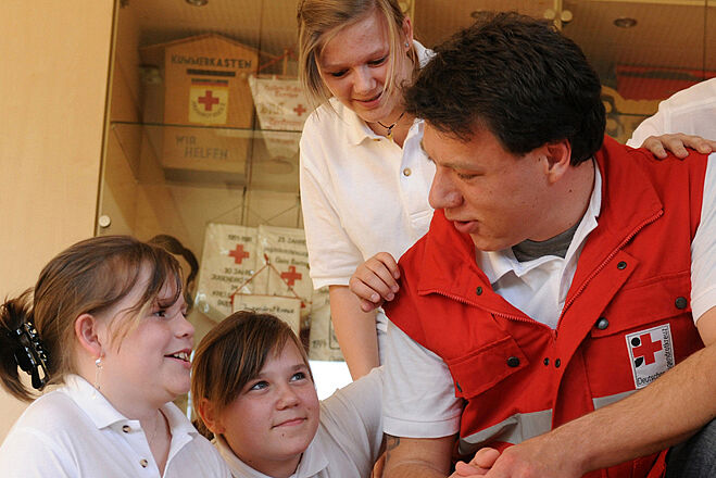 Inklusion und jung und alt, Rotkreuz Symbolfotos, Babysitterausbildung, Flugdienst, Kontakt-/Begegnungsstätte für Arbeitslose, Kleiderläden / Kleiderkammer, Ambulante Pflege